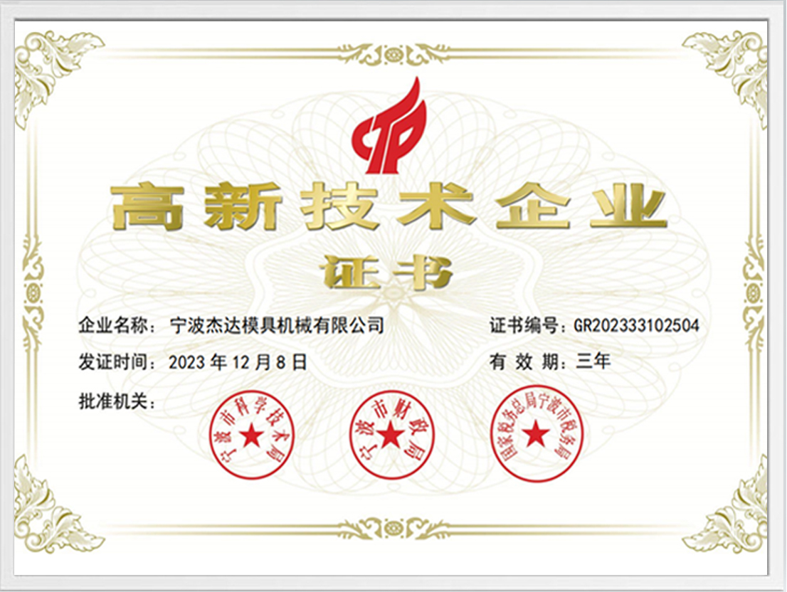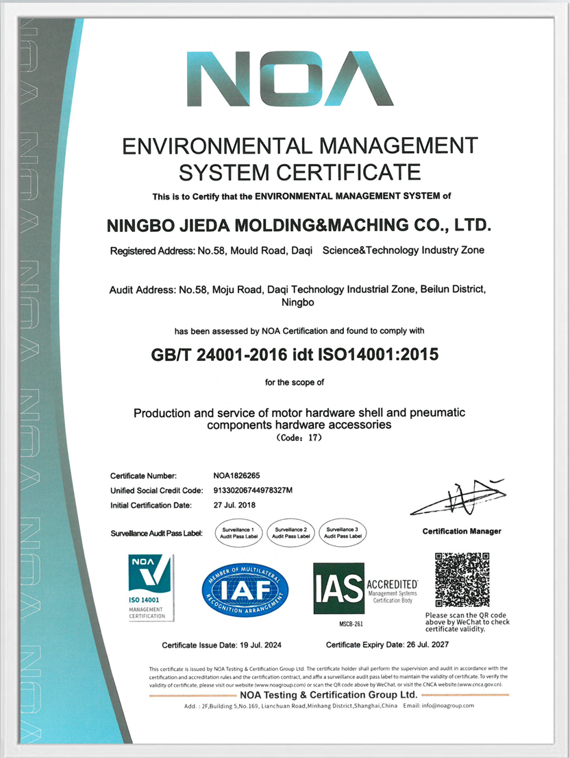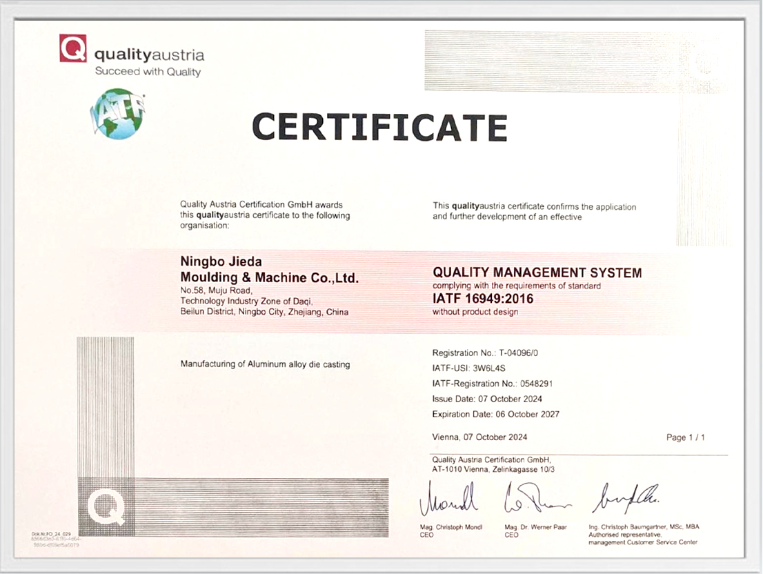 Jako krajowe zaawansowane technologicznie przedsiębiorstwo integrujące projektowanie i produkcję aluminium odlewanych przez aluminium formy i precyzyjne części odchudzające, Ningbo Jieda Molding & Machine Co., Ltd przylega do filozofii biznesowej „poszukiwania prawdy od faktów i szczerości służby„ od czasu jej ustanowienia, i jest zobowiązuje się do zapewnienia klientom w pełnym zakresie rozwiązań od formy. Firma przekazała nie tylko certyfikat systemu zarządzania jakością IATF16949, ale także wprowadziła systematyczny model zarządzania zamkniętą pętlą, aby zapewnić zapobieganie ryzyku, cele są jasne, procesy są jasne, dane są obiektywne i wprowadza się ciągłe doskonalenie, co stanowi solidne podstawy dla jakości produktu i zadowolenia klienta.